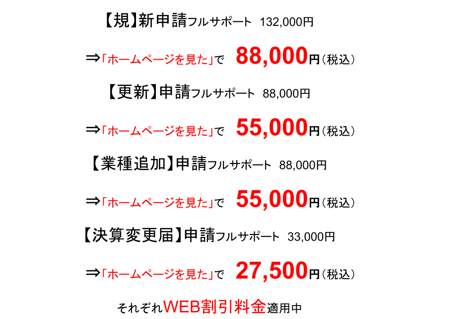 *法定費用(新規9万円・更新/業種追加5万円)は別途必要です。 (オンライン申請の場合、自社にて指定金融機関にお振込みいただきます。)